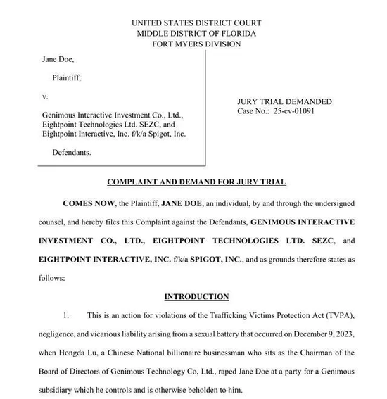 一则来自美国的诉讼文书被上海证券报捅了出来,一起发生在两年前的性侵案被曝光。据该报4月27日报道,美国佛罗里达州中区地方法院一份签署于2026年2月的裁判文书显示,一名27岁女性控告名为“Hongda Lu”的中国公民,于2023年12月在当地迈尔斯堡对其实施强奸。文书明确指出,“Hongda Lu”系智度股份英文注册名称Genimous Technology Co., Ltd.的董事长。上述原告方还向Genimous Interactive Investment Co., Ltd.、Eightpoint Technologies Ltd. SEZC和Eightpoint Interactive, Inc.三家公司提出承担过失责任和替代责任的诉讼请求,不过上述请求因不属于管辖范围而遭佛罗里达州中区地方法院迈尔斯堡分院暂时驳回。而智度股份年报披露信息显示,前述三家公司均为智度科技境外经营实体。据报道,该案将于当地时间5月4日举行听证会。